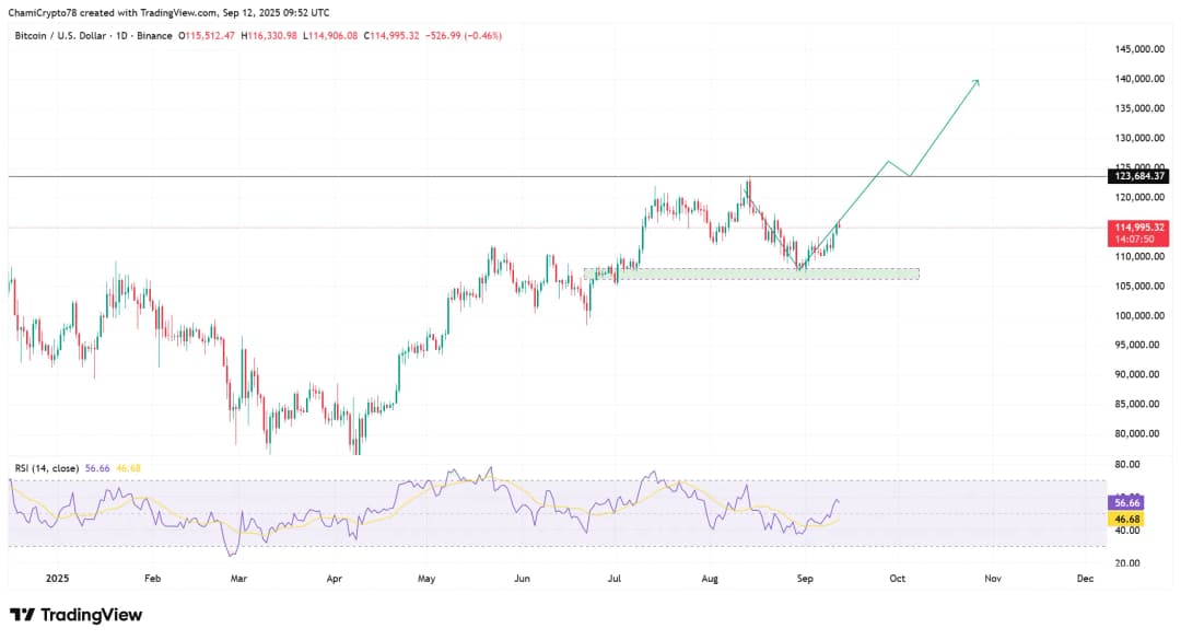 در زمان انتشار این مقاله بیت کوین پس از بازگشت از یک ناحیه تقاضای حیاتی نزدیک به 110هزار حوالی 115هزار معامله میشد که نشاندهنده حمایت قوی است. شاخص قدرت نسبی (RSI) روی 56 قرار داشت و نشان میدهد مومنتوم سالم است بدون اینکه بیش از حد کشیده شده باشد. مسیر پیشبینیشده احتمال بریک اوت به سمت 123هزار را نشان میدهد و در صورت ادامه تقاضای صعودی میتوان اهداف بالاتر تا 140هزار را دید. اما اگر بیت کوین نتواند 123هزار را بهطور قاطع پس بگیرد، بازار ممکن است با تجمیع مجدد روبرو شود. بنابراین خریداران باید ناحیه 110تا 112هزار را حفظ کنند، چون از دست دادن آن ممکن است باعث بازگشتهای عمیقتری قبل از تلاش مجدد به بالا شود.