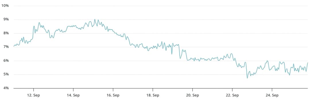 قراردادهای آتی دوماهه بیت کوین حدود 5 درصد بالاتر از بازار اسپات معامله میشوند. این محدوده خنثی (بین 5% تا 10%) نشان میدهد علاقه برای پوزیشنهای صعودی محدود است و فروشندگان هم با احتیاط عمل میکنند.