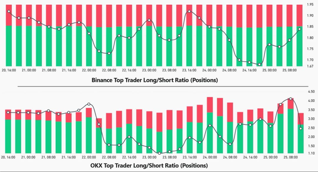 برخلاف بایننس، در OKX نهنگها و بازارگردانها پوزیشنهای صعودی بیشتری باز کردند و نسبت لانگ به شورت تا 4.2x بالا رفت. با این حال، سقوط بیت کوین به زیر 109 هزار دلار باعث شد آنها هم اهرم خود را کاهش دهند و زیان ببینند.
