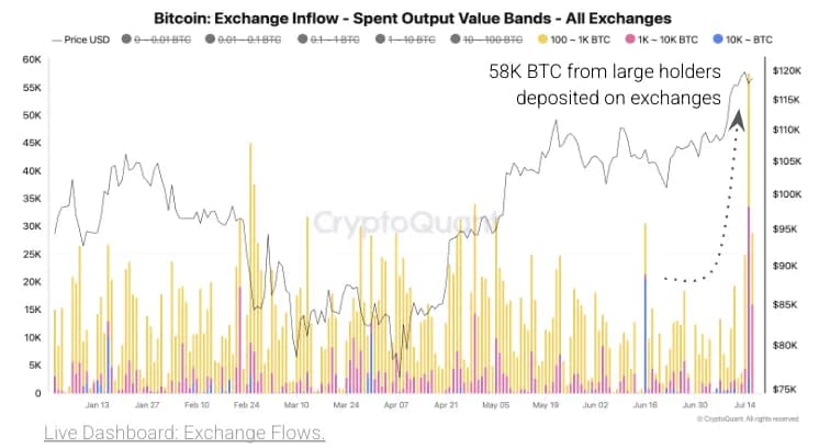 «دارندگان بزرگ بیت کوین باعث افزایش واریز بیت کوین به صرافیها شدند. مقدار روزانه بیت کوین منتقلشده به صرافیها در بستههای 100بیت کوین یا بیشتر، از 13هزار به 58هزار بیت کوین در همین بازه زمانی افزایش یافته است.»