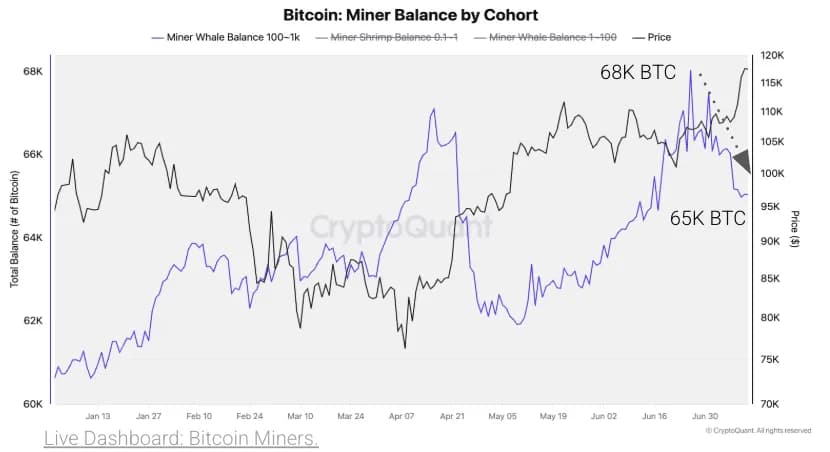 بر اساس این دادهها، بخشی از این فروشها از سوی بزرگترین ماینرهای بیت کوین صورت گرفته که با هدف کسب سود بیشتر، بیت کوینهای خود را به بازار عرضه کردهاند و این موضوع میتواند باعث کاهش یا افزایش نوسان قیمت در کوتاهمدت شود. همچنین ماینرهایی که بین 100 تا 1000بیت کوین در اختیار دارند، میزان موجودی کیف پول خود را از 68 هزار بیت کوین به 65 هزار بیت کوین کاهش دادهاند. این یعنی آنها از اواسط ژوئن تاکنون 3 هزار بیت کوین فروختهاند.