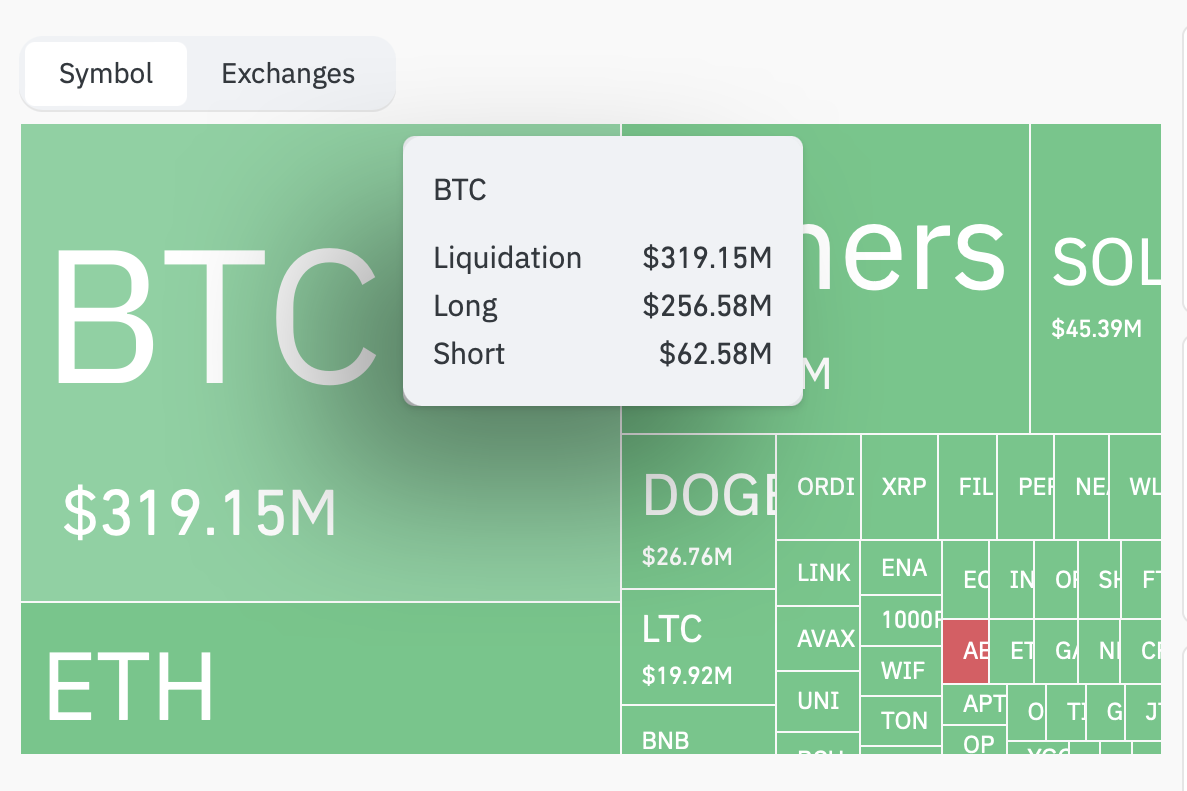 سقوط ناگهانی قیمت منجر به انحلال 319.15 میلیون دلار از موقعیت های اهرمی بیت کوین در 24 ساعت گذشته شد.
