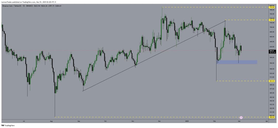 مقاومت کلیدی بعدی در حدود 732 تا 740 دلار قرار دارد که با یک اوج ساختاری قبلی همزمان است. اگر بایننس کوین بتواند از این سطح عبور کند، ادامه حرکت به سمت مقاومت 793 دلار محتمل میشود.