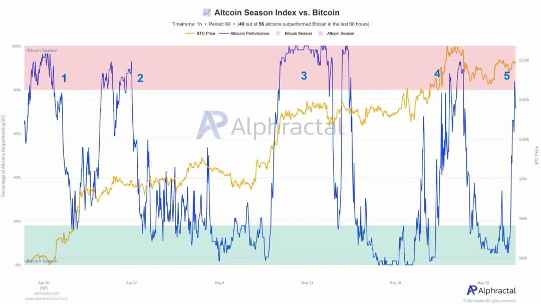 اما در 2025، بازی بسیار متفاوت است. بین آوریل و اواخر می، شاخص آلت سیزن پنج بار بالای آستانه 75٪ رفته است که هر کدام نشان از برتری لحظهای آلتکوینها نسبت به بیت کوین است. با این حال، بیشتر این جهشها تنها چند ساعت دوام داشتهاند.