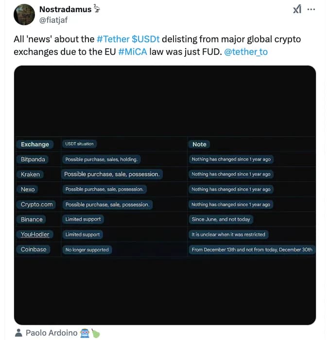«تمام “اخبار” درباره حذف تتر از صرافیهای بزرگ به دلیل قانون MiCA اتحادیه اروپا فقط FUD بود.»