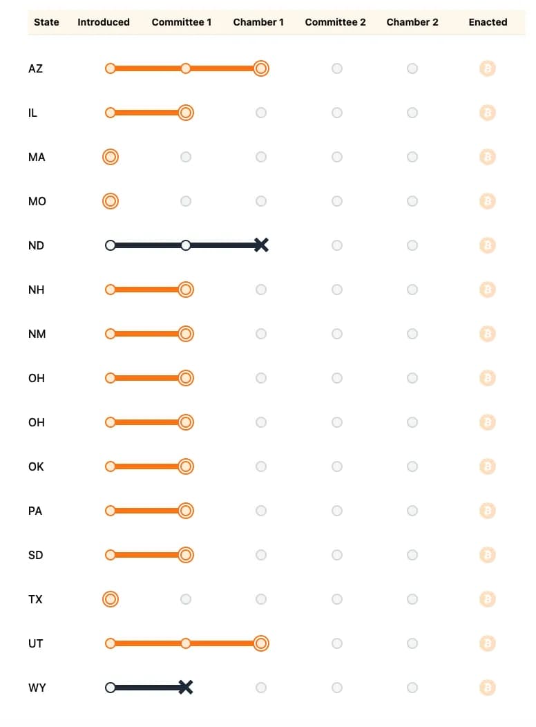 - آریزونا: پیشنهاد ایجاد ذخیره استراتژیک بیتکوین با سقف 10٪ از بودجه عمومی، در صورتی که دولت فدرال ذخیره مشابهی ایجاد کند.