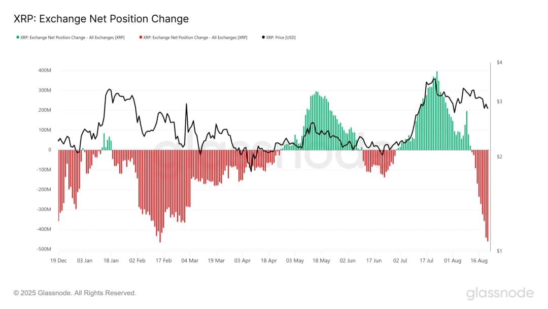 تغییر خالص موقعیت صرافی‌ها در نیمه دوم آگوست به‌طور عمیق منفی شد. بزرگی این تغییر با تغییر فوریه رقابت می‌کرد. تغییر منفی موقعیت‌ها در صرافی‌ها به‌معنای کاهش عرضه نگهداری‌شده در کیف‌پول‌های صرافی است که نشان‌دهنده انباشت از سوی دارندگان است. این خبر برای دارندگان مثبت بود و نشان می‌داد بازار انتظار دارد ریپل در هفته‌ها و ماه‌های آینده حتی بالاتر رود.